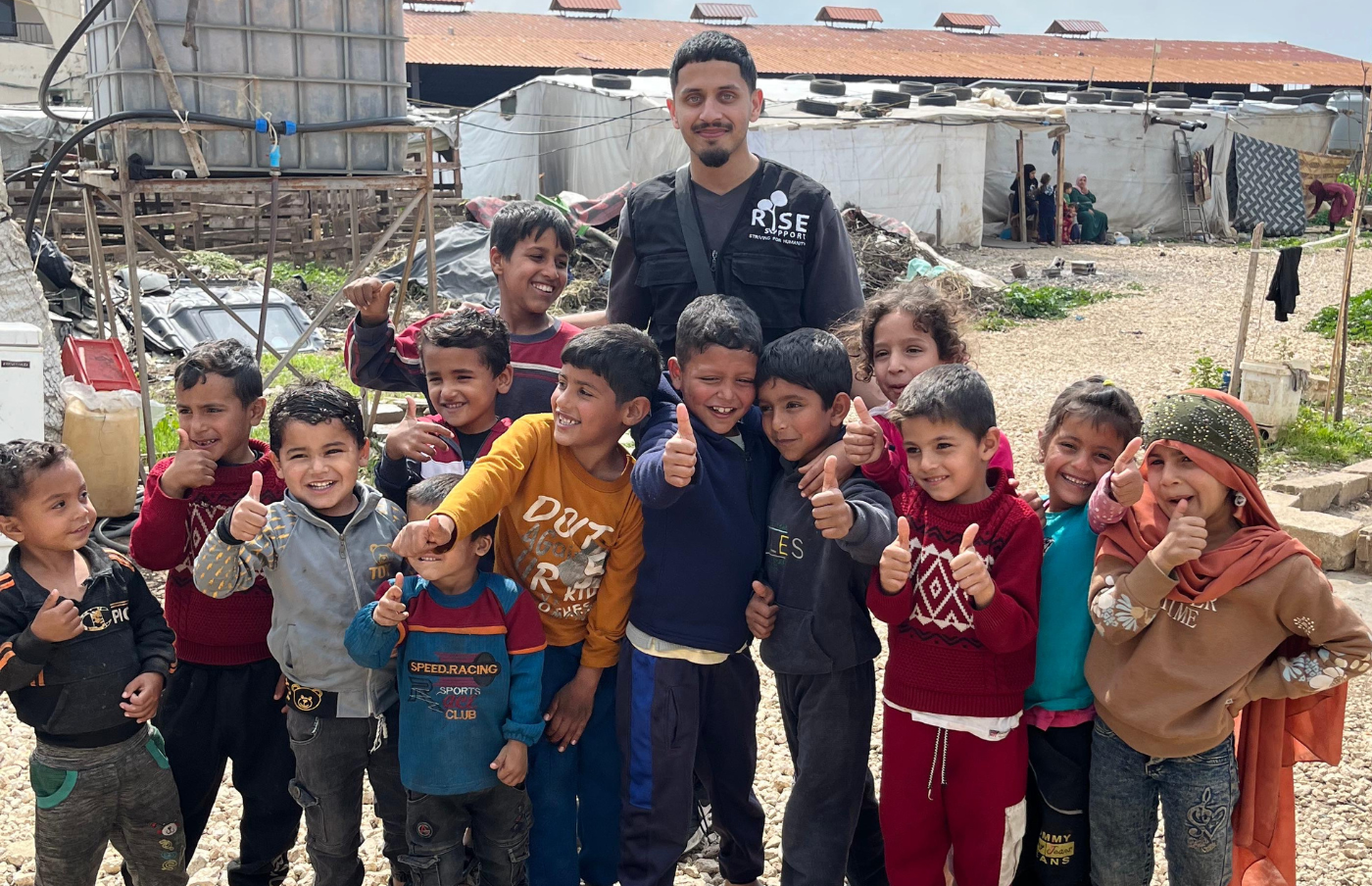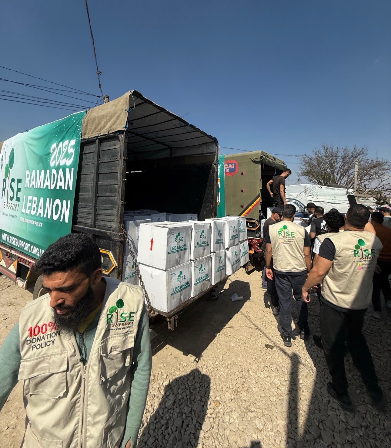 🚐 Caravans: Solid shelter units housing 5 to 6 families, providing far greater safety, privacy, and protection than tents.